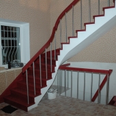 Это превосходный вариант лестницы для частного дома в стиле хай-тек или для офисных помещений. Данная конструкция изготавливается из монолитного железобетона, для облицовки ступеней используется керамический гранит, а ограждения выполняются из стекла и нержавеющей стали.