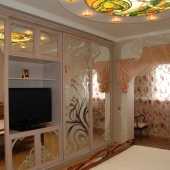 Великолепный шкаф для спальной комнаты, выполненный из натуральной древесины и стекла с оригинальной узорной росписью, станет настоящим предметом искусства в Вашем интерьере. Производство деревянной мебели «КВАЛИТИ» позволит Вам заказать данный шкаф по индивидуальным размерам.