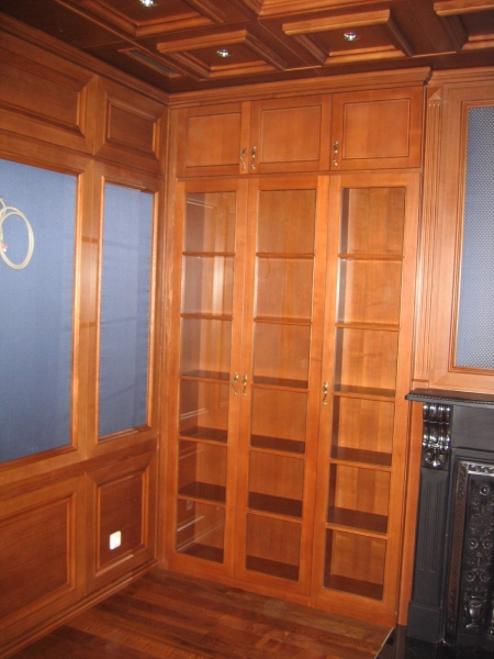 Данный проект кабинета предусматривает наличие максимально возможного количества мест для хранения документов, книг, канцелярских принадлежностей и т. п. Он выполнен из натуральной древесины дуба. В качестве декоративной составляющей дизайнерами было выбрано цветное матовое стекло. Вместе с этим кабинетом Вы можете заказать в нашей компании производство лестниц, строительство каминов, разработку и реализацию других дизайнерских проектов.